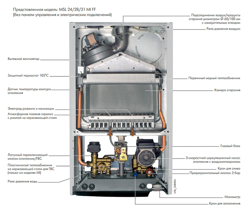 - Расширительный бак объемом 8 литров (MSL 24 MI/ 24 MI FF) или 10 литров (MSL 28 / 31 MI FF).