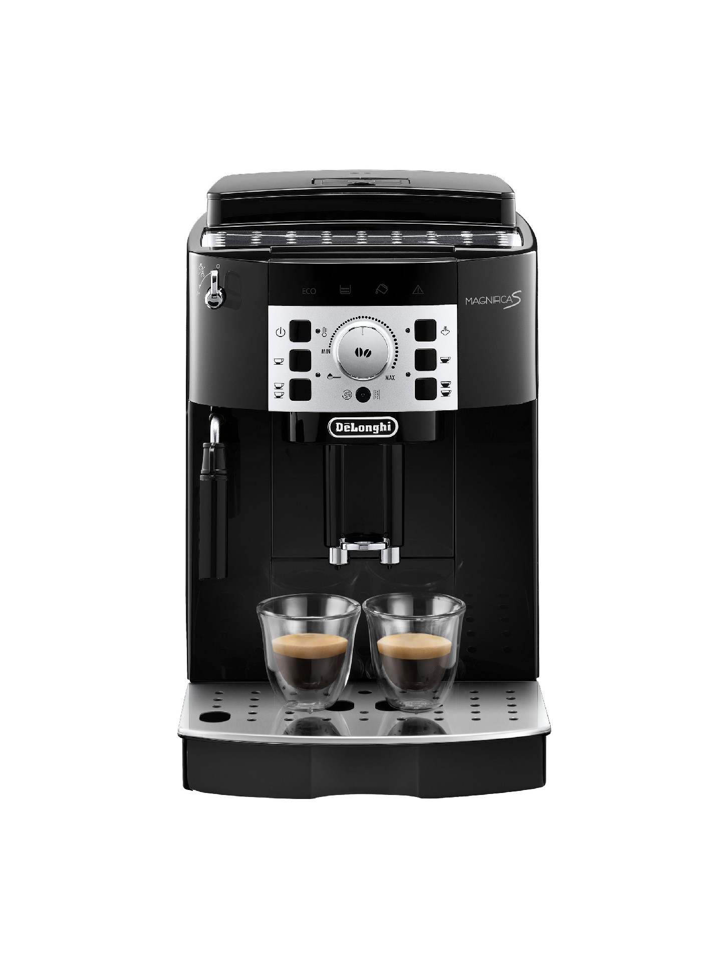 Автоматическая кофемашина Magnifica S ECAM 22.110 оборудована встроенной кофемолкой. Жернова сделаны из стали, что гарантирует прочность и надежность, поэтому устройство прослужит вам долго. Желаемую степень помола можно выбрать из 13 уровней. Контейнер для зерен имеет специальную плотную крышку, которая позволяет сохранять аромат. Если же вам захочется приготовить кофе уже из предварительно молотого кофе, тогда кофемашина легко это сделает, поскольку оборудована этой возможностью. Кофемашина оборудована простой и понятной кнопочной панелью управления. Вращением регулятора можно изменить крепость кофе, а нажатие кнопки позволяет выбрать порцию необходимого объема. Так же можно запрограммировать нужную температуру и жесткость воды. Кофемашина имеет традиционный ручной капучинатор. С его помощью вы с легкостью можете приготовить любимый капучино. Для этого необходимо поднести емкость с молоком под капучинатор, и уже через несколько мгновений вы получите взбитую молочную пену.