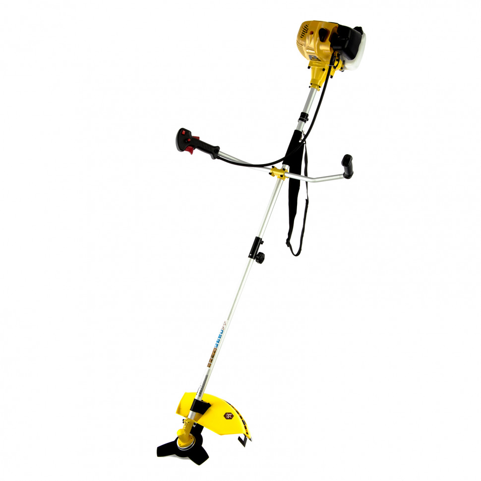 Полуавтоматическая катушка с леской, трехлопастной диск и ремень в комплекте.