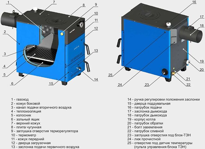 Корпус котла под декоративной обшивкой изолирован бальзатовым картоном. Данная особенность снижает теплопотери водяной рубашки;